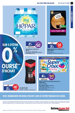 ** Jeu avec obligation d’achat valable du mardi 15 juin au dimanche 27 juin 2021 (selon horaires et jours d’ouverture. Voir informations et magasins participants sur www.intermarche.com) ouvert à toute personne majeure au 15/06/21 et résidant produit ou lot de produits éligibles promus (montant payé déduit de toutes les réductions et dans la limite de trois produits identiques). Le bon d’achat est utilisable pour un futur