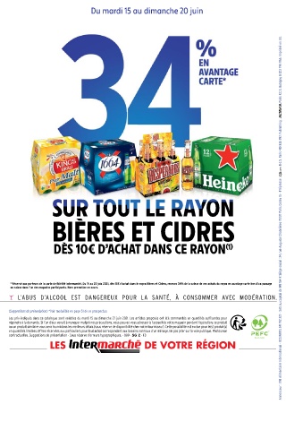 (1) Réservé aux porteurs de la carte de fidélité Intermarché. Du 15 au 20 juin 2021, dès 10€ d'achat dans le rayon Bières et Cidres, recevez 34% de la valeur de vos achats du rayon en avantage carte lors d'un passage