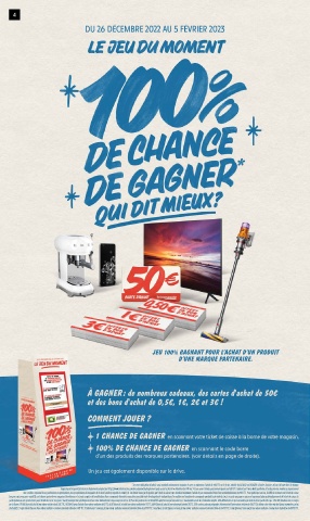 de 3€ TTC. 10 306 dotations mises en jeu sur le Drive : 4 795 bons de réduction d’une valeur unitaire de 5€ TTC, 2 055 bons de réduction d’une valeur unitaire de 10€ TTC, 450 bons de réduction d’une valeur unitaire de 50€ TTC, 1 aspirateur Dyson d’une valeur unitaire commerciale ind