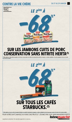 (1) Offre valable sur l’intégralité des jambons cuits de porc conservation sans nitrite de la marque Herta présents en magasin. La remise s’applique lors de votre passage en caisse sur le moins