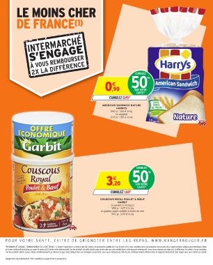 (1)INTERMARCHÉ S’ENGAGE - REMBOURSEMENT DE LA DIFFÉRENCE : si, durant l’opération « Le moins cher de France » du prospectus valable du 21 au 26 mars 2017, vous constatez dans une enseigne concurrente (hors vente en ligne, soldeurs et promotions) située