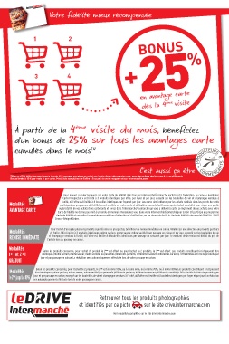 (1)Bonus +25% définitivement acquis lors du 4ème passage en caisse ou achat sur le site drive.intermarche.com, pour des achats réalisés sur 4 jours différents.